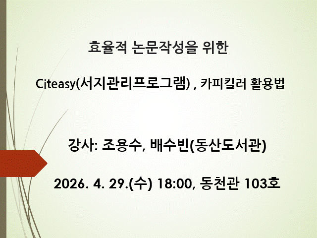 대학원생(대학생)의 논문 작성을 위해 Citeasy(서지관리프로그램), 카피킬러 활용법 특강을 다음과 같이 실시 하오니 많은 참여바랍니다.