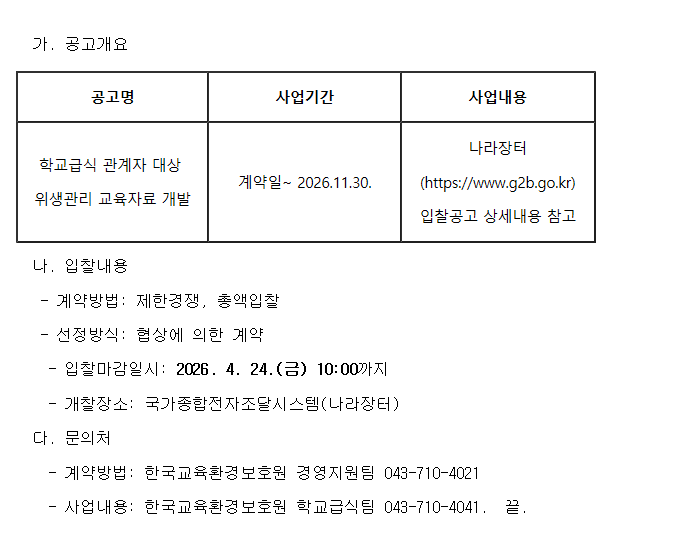 '학교급식 관계자 대상 위생관리 교육자료 개발' 연구과제 공고 안내